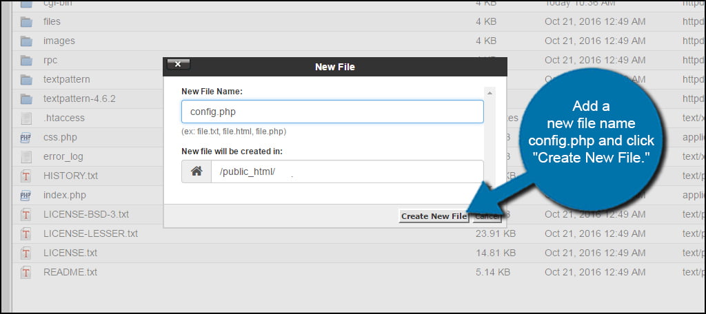 Go back to your File Manager in cPanel and click the “+ File” button. Make sure you’re in the Textpattern directory within your website before creating this file.