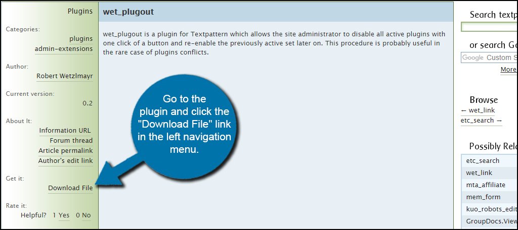 The first thing you’ll need to do is download the plugin you want. It’s best to get these add-ons from the Textpattern website. However, plugins are available in several other places on the Internet. Just be careful when installing code from a third party. You never know what you might be adding to your site.