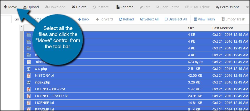 Change the file path to your root directory and click “Move File(s).” Most people will just use the “/public_html/” folder.