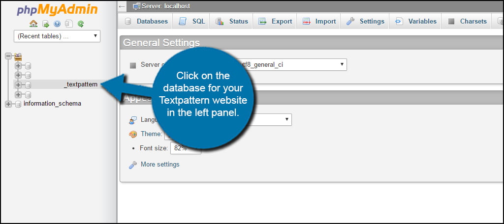 Give your database a name and click the “Next Step” button. This will be used when first installing Textpattern and will govern over all of your site’s data. For this example, I’m simply setting up “textpattern.”