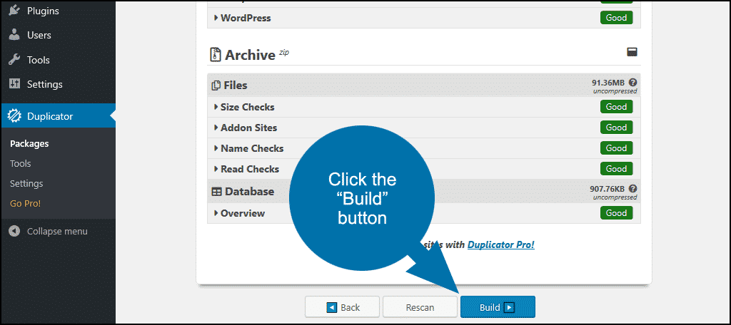The site will be scanned, and you’ll come to a “Scan Complete” page. If all of the checks are “Good” (green), click the “Build” button.