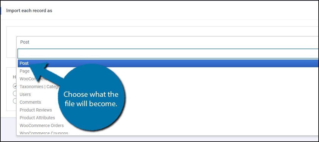 You can now select what the file will become. The plugin provides a lot of options to choose from and some of these include a post, page, Woocommerce products, taxonomies, users, comments, product reviews, and much more.