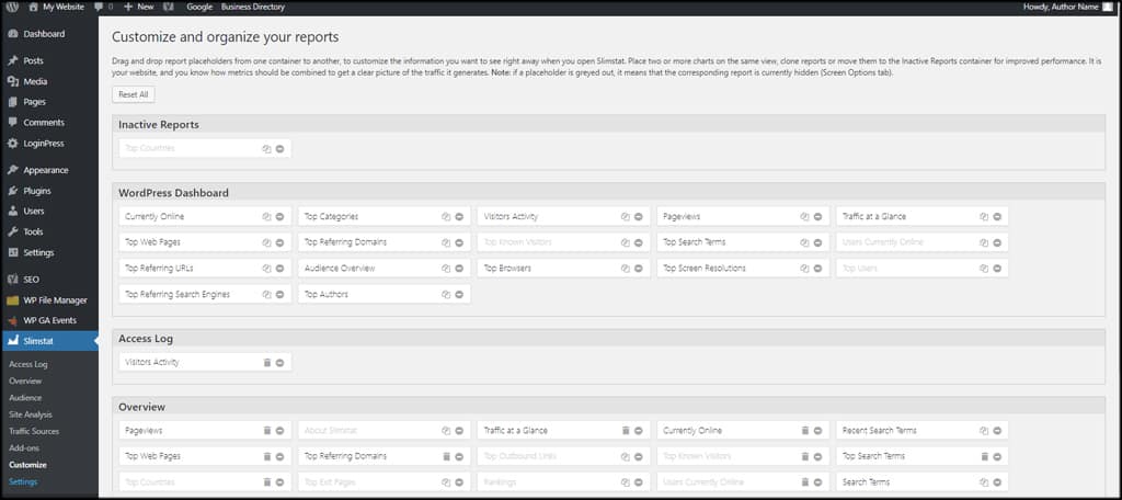 By default, Slimstat includes a variety of reports for the WordPress dashboard. These can be altered by going to the Customize screen I mentioned a minute ago.